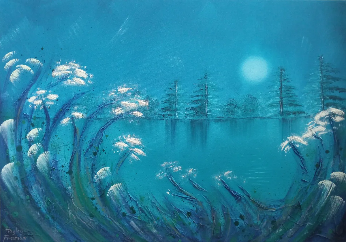 This picture portrays spectacular blue hues over a river bank under the soft tranquillity of the moonlight. Riverside foliage sways in the warm night breeze.